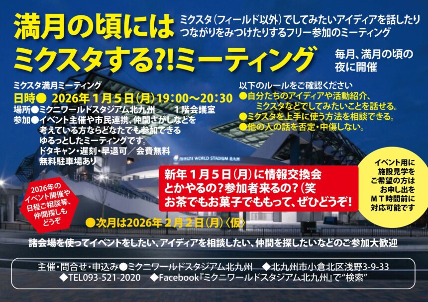 ミクスタ満月ミーティングは、満月の頃に開催されるミクニワールドスタジアム北九州を舞台とした、イベントや企画のアイディアを自由に話し合うためのミーティングです。