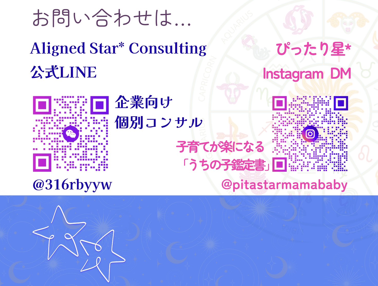 ご自身の出生図ホロスコープでは、生まれ持った個性や性格強みや人生の課題を読み解くことができます。新しく何か始めたい方や、今のお仕事・生活がに悩みがあり、進みきれていないな…と思われる方は、ぜひ一度、ぴったり星*のホロスコープ鑑定をご依頼くださいね。