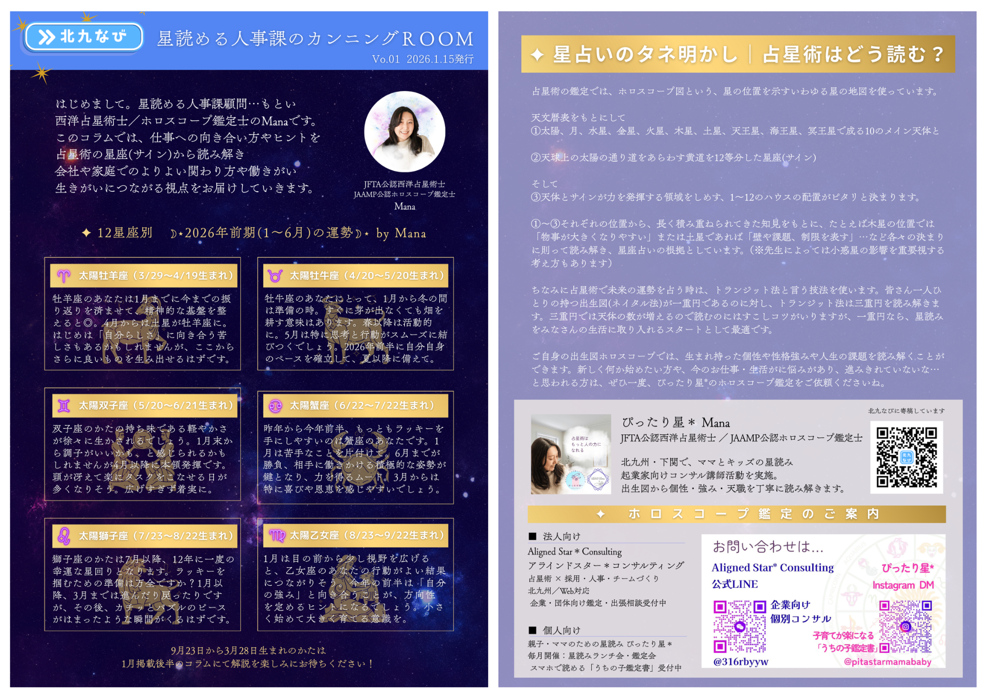 北九州市内と下関市にて、ママとキッズのためのホロスコープ鑑定、占星術の歴史と根拠に基づいた起業家向けコンサル活動、講師活動を行う。