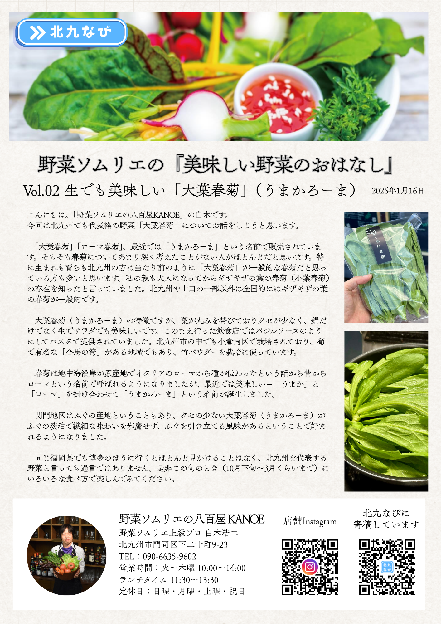 Vol.02 生でも美味しい「大葉春菊」(うまかろーま)