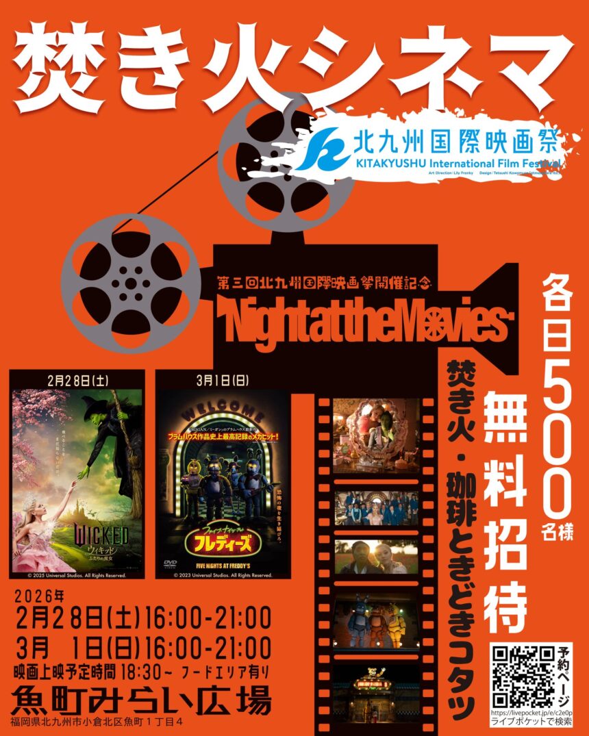 冬の夜、揺れる炎を囲みながら映画に没入する——。「NIGHT AT THE MOVIES」は、北九州国際映画祭の特別な夜、冬限定の屋外シアターイベントです。