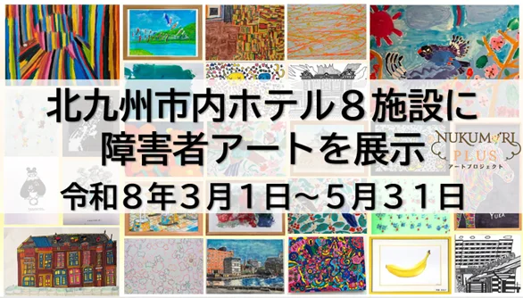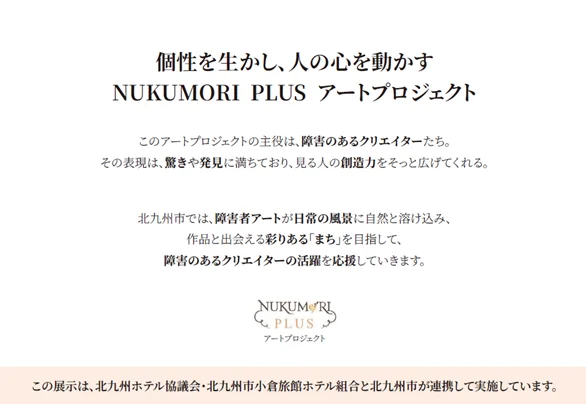 旅の玄関口であるホテルに入った瞬間、思わず足を止めてしまう——。そんな“心動く出会い”が、いま北九州の街で生まれています。障害のあるクリエイターの作品が市内8つのホテルに展示される「NUKUMORI PLUS(ぬくもりプラス)アートプロジェクト」。お出かけの途中にふと出会うアートが、心をやさしく動かしてくれる。そんな新しい北九州の魅力をご紹介します✨
